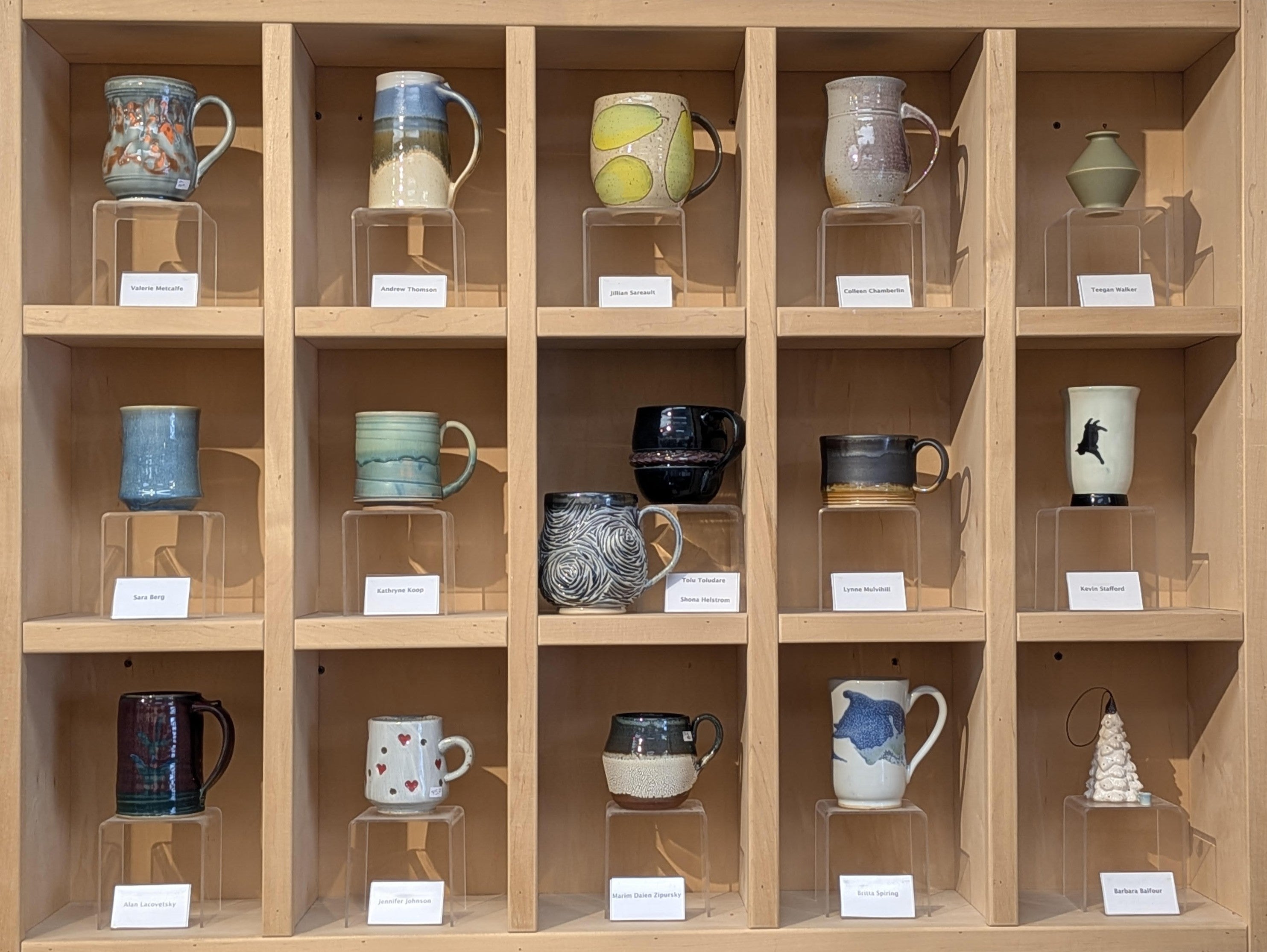 The Stoneware Gallery celebrated its 40th anniversary in 2018 and currently has 16 members. The Mug Wall represents each artist that is a part of the Gallery.